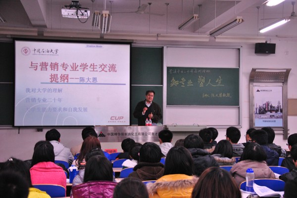 講座伊始,陳大恩以自己在各國的學習經歷為出發點,聯系世界各個大學的概況,向同學們講述了大學的特征并強調了大學生活在人生中所起到的重要作用,勉勵同學們要明確自己的人生目標,更好地規劃大學生活,扎實基礎、拓寬視野,成為學會獨立思考的創新型人才。接著,他講述了營銷專業的創始及發展,使同學們清楚地了解營銷專業的發展方向,還特別強調了營銷專業作為石大特色專業的優勢,闡明了其在石油、能源等領域的發展潛力和發展前景。隨后,講座進入現場問答環節,就同學提出的關于營銷專業能力培養、社會實踐、就業前景等問題,陳大恩進行了一一解答,現場氣氛熱烈。