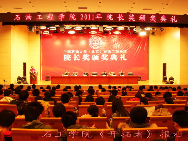 3月30日下午,中國石油大學石油工程學院2011年度院長獎頒獎典禮在中油大廈三層報告廳隆重舉行。副校長吳小林、教務處處長陳小宏、國際合作與交流處處長孫旭東、學生資助中心主任姜立國,以及石油工程學院院長陳勉、黨委書記寧正福、黨委副書記梁永圖參加了典禮。頒獎典禮由寧正福主持。