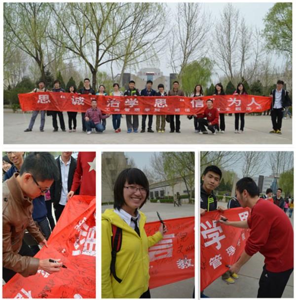 當前位置: 首頁» 院系經緯 石大商學院舉辦“思‘誠’治學、思‘信’為人”主題教育活動 發布時間:2012-04-11 | 來源:工商管理學院 | 作者:李觀 | 攝影:郭峰 | 瀏覽量: 4月10日,商學院在學校南門小操場舉辦“思‘誠’治學、思‘信’為人”主題教育活動。本次活動以“誠信治學”和“誠信做人”為主題,以“倡導誠信”為目的,在全校范圍內開展簽字承諾儀式。此次活動以同學們親身參與實踐的方式,達到了非常好的效果。同學們認識到無論是學習、工作還是做人,“誠信”都是非常重要的一部分。 分享到: 排行榜 薦讀 中石大召開2024年全面從嚴治黨工作部署會暨... 對口支援中國石油大學(北京)克拉瑪依校區工作... 中石大獲評 “昌平區學習型示范高校” 中國石油大學2022年十大新聞揭曉 新年賀詞 | 雄關漫道 惟有登攀