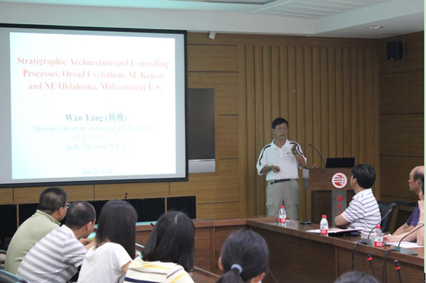6月20日,密蘇里州科學(xué)技術(shù)大學(xué)楊晚教授受地學(xué)院紀(jì)友亮教授的邀請(qǐng),為石大師生做了場(chǎng)題為《Stratigraphic Architecture and Controlling Processes, Oread Cyclothem, Southeastern Kansas and Northeastern Oklahoma, Midcontinent U.S.A.》的精彩報(bào)告。