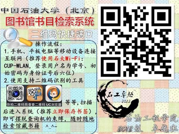 當前位置: 首頁» 院系經緯 石大石油工程學院學生制作圖書館檢索二維碼 發布時間:2013-03-27 | 來源:石油工程學院 | 作者:顏元 | 瀏覽量: 3月25日,石大石油工程學院石工12級卓越班三名同學前往校圖書館粘貼圖書館檢索二維碼。 圖書館檢索二維碼是石工12級卓越班同學為方便廣大師生檢索書籍而設計制作的。目前大多數電子設備具備掃描二維碼功能,針對圖書館系統特別設計的圖書館檢索二維碼能通過這些移動設備快速打開圖書檢索頁面,讓全校師生不再受固定機器的限制,隨時隨地輕松查詢,有效緩解了排隊等候時間長、部分查詢機功能失靈等問題。 分享到: 排行榜 薦讀 中石大召開2024年全面從嚴治黨工作部署會暨... 對口支援中國石油大學(北京)克拉瑪依校區工作... 中石大獲評 “昌平區學習型示范高校” 中國石油大學2022年十大新聞揭曉 新年賀詞 | 雄關漫道 惟有登攀