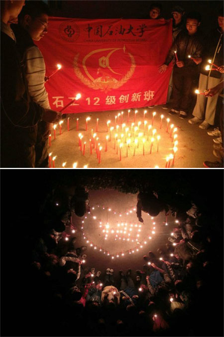 4月21日晚,石大石油工程學(xué)院12級(jí)石工創(chuàng)新班的同學(xué)在潤杰公寓內(nèi)發(fā)起以“情系雅安,四川加油”為主題的祈福活動(dòng)。在四川籍同學(xué)的帶領(lǐng)下,大家把蠟燭圍成心形,沉痛默哀后共同喊響了“多難興邦,四川加油”的口號(hào),寄托了自己的哀思與祝福。