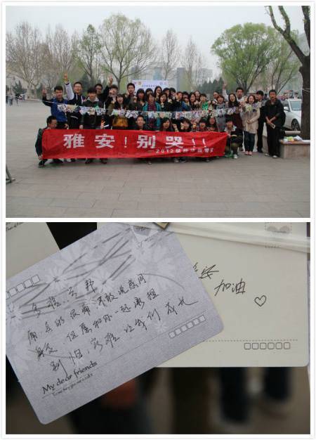 4月22日下午,工商管理學(xué)院經(jīng)濟(jì)、信管2012級(jí)學(xué)生進(jìn)行了“雅安不哭——明信片傳遞愛心”活動(dòng)。活動(dòng)現(xiàn)場,近百人參與郵寄明信片,愛心簽名,鼓勵(lì)災(zāi)區(qū)同胞。4月23日上午,工商管理學(xué)院管理2012級(jí)學(xué)生在南廣場手系綠絲帶,擺出“8:02”的造型,祈禱在黃金72小時(shí)過去之后,能有更多的傷者被救出。同時(shí),學(xué)生們也對逝者表達(dá)了深深的哀思。