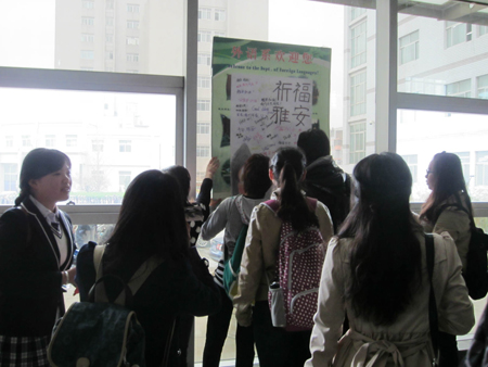 4月23日上午,外國語學(xué)院英語12級(jí)2班的同學(xué)自發(fā)在校園內(nèi)擺出愛心祈福板,深深地緬懷在雅安地震中遇難的同胞,為四川雅安同胞祈福。路過同學(xué)紛紛在祈福板上留言,表達(dá)自己對災(zāi)區(qū)的祝福。