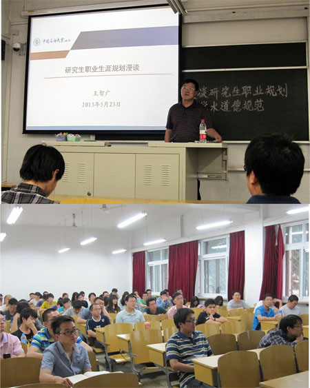 在研究生學術道德問題上,王智廣對石大研究生在科學研究和學術活動中應該遵守的學術規范做以解釋說明,同時舉例說明學術道德缺失的后果,告誡研究生要嚴格遵守中國石油大學關于《研究生在科學研究和學術活動中應該遵守的學術規范》的相關規定。
