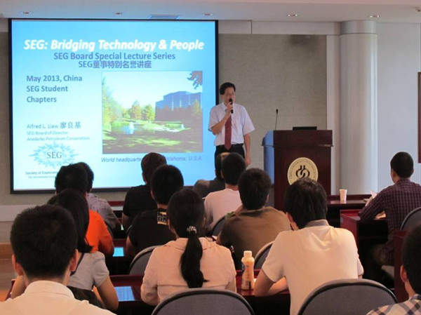 5月28日下午,勘探地球物理學(xué)家學(xué)會(Society of Exploration Geophysicists, SEG) 董事特別名譽講座系列(Board Special Lecture Series)在國際會議中心306會議室舉行,廖基良博士(Dr. Alfred Liaw)為石大師生作了題為“SEG: Bridging Technology and People”的演講。