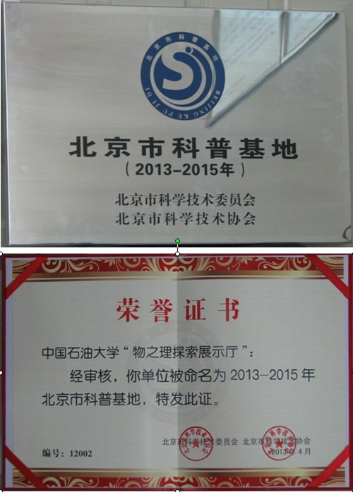 為動員社會力量參與科普,推動科普基地發展,北京市科學技術委員會(以下簡稱“市科委”)與北京市科學技術協會(以下簡稱“市科協”)組織開展了北京市科普基地復核及2012年申報工作。近期,經申報、評審、公示,共有191家科普基地通過復核,52家申報單位通過評審,市科委與市科協決定,共同命名243家單位為北京市科普基地,命名周期為2013—2015年,頒發北京市科普基地證書和牌匾。中國石油大學理學院物之理探索展示廳入選北京市科普基地。