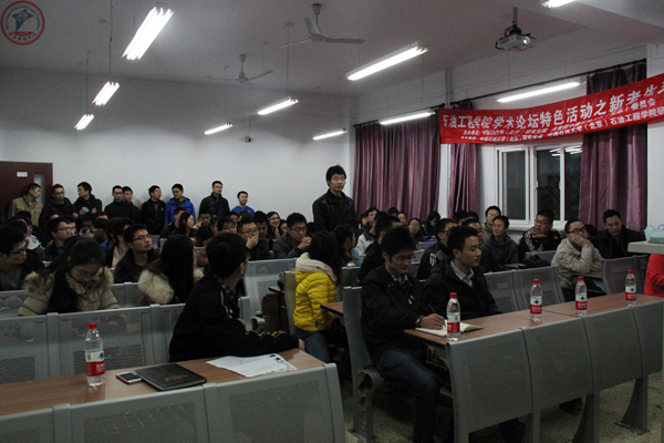 3位研究生分別為大家詳細地介紹了塔里木油田開發事業部采油工程部、中海油鉆采院和中國石油集團鉆井工程技術院三個工作站的自然條件、工作條件和生活條件,并講述了在工作站實習期的經歷和體會。他們強調,在實習工作中一定要敢于創新,把握機會,多學習,多溝通,帶著足夠的熱情投入到工作和生活中去。在互動環節中,同學們積極參與,提出自己的問題,3位研究生都做了耐心細致的解答。熊文學還針對就業和升學的問題與大家進行了較為深入的交流。