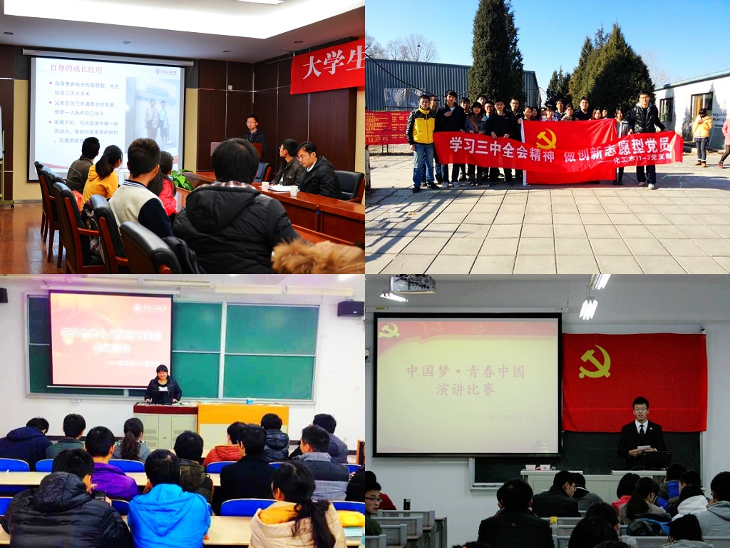 化工學院學生黨員積極響應號召,以支部為單位開展“深入學習貫徹十八屆三中全會精神”主題組織生活會,各支部學習了《中國共產黨十八屆中央委員會第三次全體會議公報》與《中央關于全面深化改革若干重大問題決定》,并展開討論,切實把思想和行動統一到全會精神上來。各學生黨支部在深入學習基礎上,走出校園,將學習所得與黨的群眾路線教育聯系起來,廣泛開展實踐活動:化工本12黨支部在深入學習基礎上,組織了“中國夢·青春中國”演講比賽;化工本13黨支部開展“我的大學夢”報告會,化工學院團委書記張延港出席本次會議,報告會中,獲得“潛能恒信,十佳十強”稱號的學生代表胡亞君,鄧智勇等分享自身經歷與學習經驗,以激勵新生自學自強,確定大學目標,樹立成功信心;化工本11-1、11-2黨支部攜手下轄8個團支部積極分子走入昌平區溫馨家園開展“踐行全會精神,共建溫馨家園”主題志愿服務活動;化工本11-3黨支部走進昌平小動物保護中心開展主題為“學習三中全會精神,做創新志愿型黨員”主題實踐活動。同時,化工學院充分重視學生黨員干部作用的發揮,組織全院50余名黨支部書記、黨員干部及全體輔導員于12月6日舉辦“先學早學,率先示范—深入學習十八屆三中全會精神”主題培訓會,邀請了學工處教育科科長閆亮亮與校黨委組織員吳肇亮就“如何更好的開展‘紅色1+1’共建活動”和“化工學院新發展黨員思想情況”進行報告,化工學院黨委副書記胡建茹、團委書記張延港、學院辦公室主任郝雪蓮也出席了本次會議。閆亮亮認為,“紅色1+1”共建活動不僅在于加強基層組織建設,更在于鍛煉基層學生干部,推進學生了解社會、了解國情、了解民生,堅定學生的理想信念,作為當代大學生,更應該關注社會關注民生,并將所學運用于實踐中去。會議中還舉行新預備黨員集體宣誓儀式,2012-2013學年度化工學院優秀黨支部提名支部進行了工作匯報,并現場進行投票表彰。
