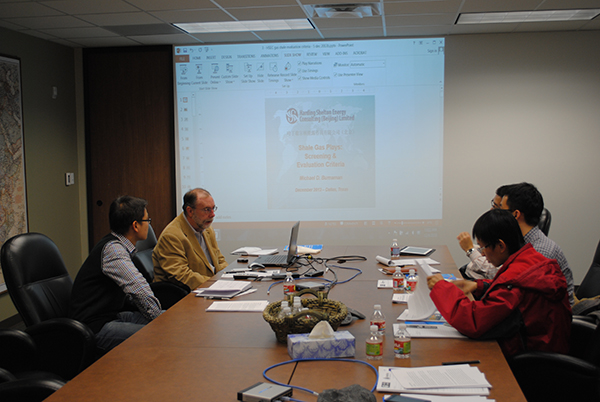 培訓中,哈丁公司總裁Michael D.Bumaman作為主講人,對美國非常規油氣開發的發展歷史、發展現狀及發展趨勢進行了介紹,并針對頁巖氣和致密油水平井鉆完井技術、水力壓裂技術等方面進行了著重講解。代表團成員則針對培訓過程中遇到的各種問題與主講人進行了交流。培訓結束后,代表團向Michael D.Bumaman贈送了《全國石油工程設計大賽的宣傳冊》與《第四屆全國石油工程設計大賽實施方案》。Michael D.Bumaman向代表團贈送了Barnett頁巖氣田儲層頁巖樣品并祝福大賽能夠越辦越好。