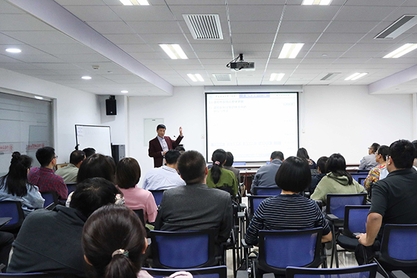 張寶生圍繞智慧教書、情感育人的主題,從高校教師精彩成長、講好一門課、用“師范”精神成就教學人生三個方面為在場教師進行了講解。他認為成為一個好教師,不僅需要上好一門課,還需要高尚的師德師風,要以德施教、以德立身,才是對學生最生動、最具體、最深遠的教育。他說,對于在校教師,特別是新上崗教師,必須時刻銘記立德樹人,為學生樹立榜樣。他提出了高校教師的具體“師范”,表示沒有科研成果就難以成為名師,強調教師在用心教學的同時也要提升自我,以達到立德樹人的教學境界。