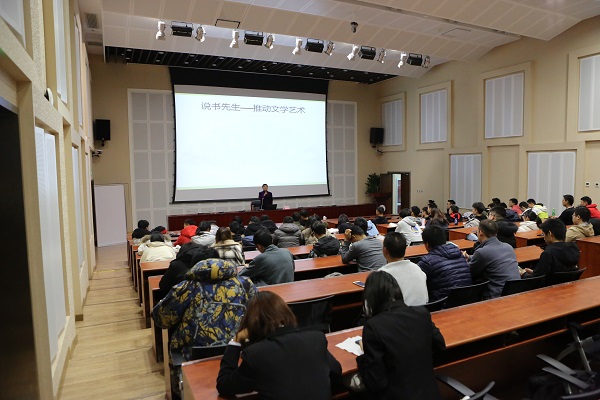 王封臣介紹了評書的“前世今生”,講述了評書推動文化掃盲與文學藝術發展的作用,展示了評書的折扇、醒木、手絹等三大道具,并為現場師生講了一段《三顧茅廬》評書。報告會后,王封臣與現場師生就評書的未來、評書如何與外國文學作品結合以及如何用評書在新時代講好中國故事等展開了交流。