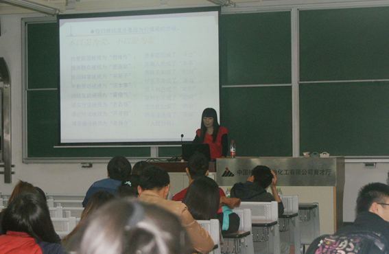 4月22日晚,石大化學工程學院在三教103舉辦“中國夢”專題理論講座,邀請到人文學院副教授韓麗紘以“解讀社會主義核心價值體系及中國夢”為題,為青年學生做了專題報告。化工學院團委書記張延港及新生輔導員參加了本次講座。