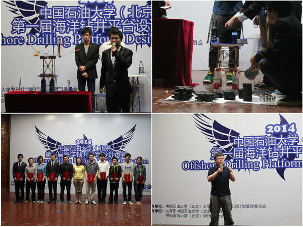 本次比賽分為初賽和決賽,共有來自7個(gè)專業(yè)的32支隊(duì)伍參加了初賽,經(jīng)過評審,9支隊(duì)伍進(jìn)入最終的決賽。決賽中,各參賽隊(duì)伍依次上臺進(jìn)行作品展示與介紹,評委老師結(jié)合作品特色進(jìn)行了提問,并對作品的整體結(jié)構(gòu)提出了改進(jìn)意見。各參賽團(tuán)隊(duì)測試了平臺的承載力參數(shù)。經(jīng)過激烈的角逐,來自2011級海洋油氣工程專業(yè)的Offshore Oil團(tuán)隊(duì)獲得了一等獎(jiǎng);來自2012級石油工程專業(yè)的Top Team of CUP團(tuán)隊(duì)獲得了二等獎(jiǎng);由石油工程學(xué)院博士生組成的Deepwater Raider團(tuán)隊(duì)獲得了三等獎(jiǎng);機(jī)械與儲(chǔ)運(yùn)工程學(xué)院研究生隊(duì)Offshore Oil Explorer和2012級石油工程專業(yè)Young隊(duì)獲得團(tuán)體優(yōu)秀獎(jiǎng)。賽后,梁永圖作了總結(jié)講話,他肯定了同學(xué)們的鉆研創(chuàng)新精神,同時(shí)也對大賽的發(fā)展寄予了深厚期望。