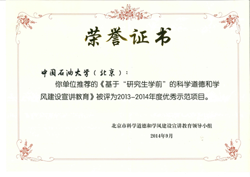 近日,北京市科學道德和學風建設宣講教育領導小組對全市范圍內各高校和科研院所的科學道德和學風建設宣講教育項目進行了評選,北京大學、清華大學、中國石油大學等單位的17個項目特色鮮明、措施得力、成效顯著,被授予2013—2014年度優秀示范項目榮譽稱號。