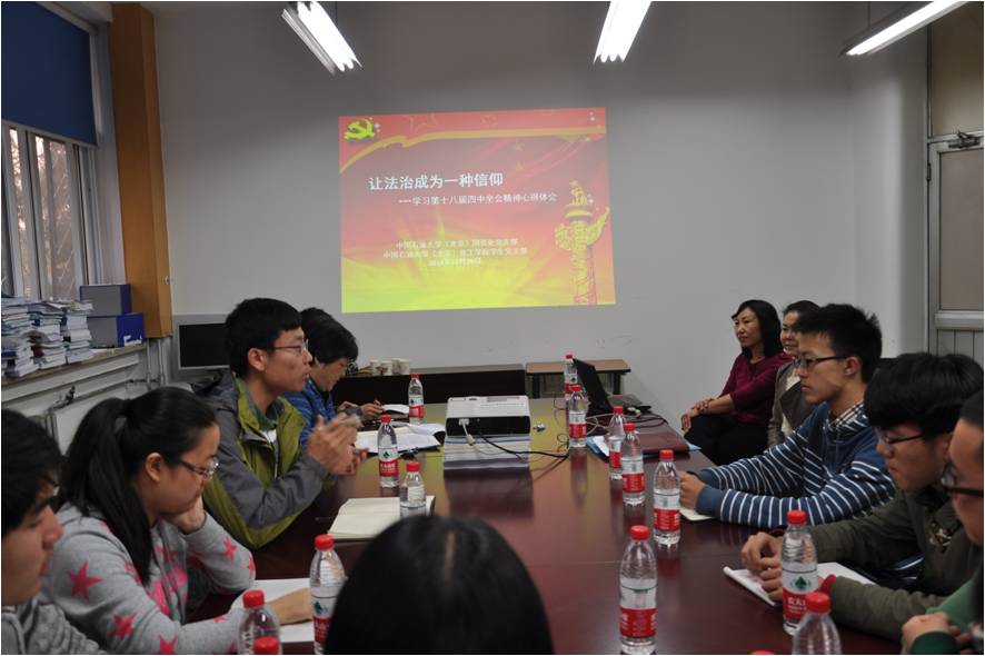 10月29日,石大國資處黨支部與化學(xué)工程學(xué)院本2013黨支部在辦公樓B座102會(huì)議室開展了題為“讓法治成為一種信仰——學(xué)習(xí)十八屆四中全會(huì)精神體會(huì)”的“一對(duì)一”黨支部活動(dòng)。機(jī)關(guān)黨總支負(fù)責(zé)人以及來自國資處黨支部和化學(xué)工程學(xué)院本2013學(xué)生支部的黨員、入黨積極分子約30人參加了活動(dòng)。