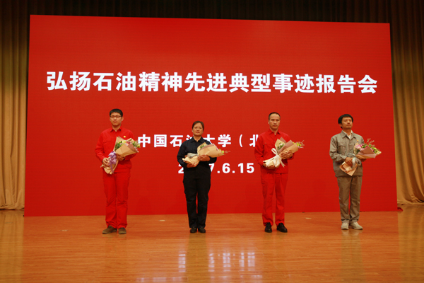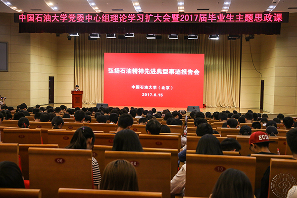 在全校師生員工深入貫徹落實全國高校思想政治工作會議精神和習近平總書記重要講話精神之際,6月15日下午,中國石油大學在中油大廈三層報告廳召開了一次意義特殊、內容特別的黨委中心組理論學習擴大會2017屆畢業生主題思政課。校領導山紅紅、張來斌、剛文哲、雷玉江、徐春明、龐雄奇,機關職能部門、直屬單位主要負責人,學院(研究院、部)黨組織書記、副書記,學生工作干部代表,2017屆畢業生代表和在校生代表共700余人共同聆聽了中國石油天然氣集團公司“弘揚石油精神”先進典型事跡報告團的感人報告。