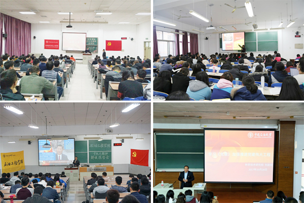 各院級單位黨組織積極舉辦十九大精神主題輔導報告會,讓十九大精神在師生中入腦入心。化學工程學院聯合機械與儲運工程學院等單位,理學院聯合體育教學部分別邀請校外專家作了題為“不忘初心的新時代”、“新時代的政治宣言和新征程的行動綱領”的輔導報告。外國語學院、石油工程學院、地球物理與信息工程學院邀請學校學習宣傳貫徹黨的十九大精神宣講團成員、馬克思主義學院教師吳建偉、張冠軍、楊曉鋒分別作了題為“新時代 新目標 新征程——中國特色社會主義的最新戰略藍圖”“新時代中國共產黨的新使命、新工程——中共十九大報告解讀”“法治中國在前行——十九大精神解讀”的宣講報告。科學技術研究院黨委書記劉韻秋、黨委副書記孫凈宇面向入黨積極分子分別作了題為“學習新黨章,加強推進黨的建設偉大工程”、“端正入黨動機,明確入黨目的”的專題講座,將黨的十九大精神和《中國共產黨章程(修正案)》相關內容融入到課程中。