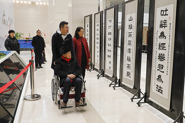 11月24日,王修齋教授攜家人來石大觀看作品展出情況,他表示,習近平總書記在重要講話、文章、訪談中的用典,古為今用、推陳出新,旁征博引、畫龍點睛,給人思想啟迪和精神激蕩,與習近平總書記治國理政思想桴鼓相應。本次創作的作品,展示了習近平總書記在敬民、為政、立德、修身、勸學、勵志、倡廉等方面論述中引用的經典名句,希望通過中華優秀傳統文化藝術形式,推進習近平新時代中國特色社會主義思想的學習宣傳。