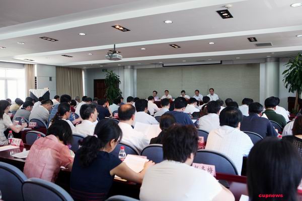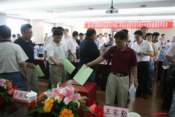 6月22日,我校召開深入學習實踐科學發展觀活動分析檢查階段總結暨校領導班子分析檢查報告評議大會,校黨委書記蔣慶哲向與會代表介紹了分析檢查報告的形成過程及主要內容,并部署了學習實踐活動第三階段,即整改落實階段的主要工作。部屬高校深入學習實踐活動領導小組第二指導檢查工作組組長、四川大學原黨委書記盧鐵城,副組長、江南大學原校長陶文沂,指導檢查工作組聯絡員王家勤,全體校領導,以及全體二級干部,黨委委員、紀委委員,教代會主席團成員,校學術委員代表,各民主黨派負責人,離退休教職工代表,學生黨員代表出席了會議。會議由校長張來斌主持。