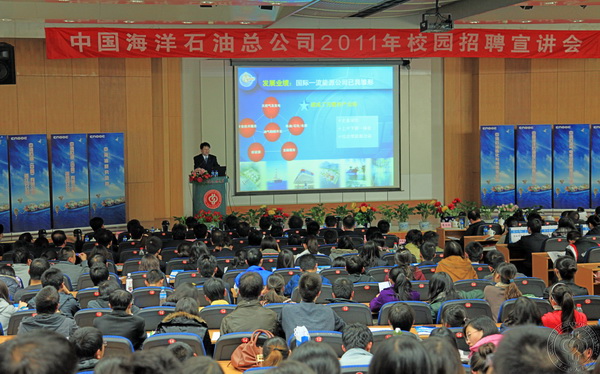 10月27日,中國海洋石油總公司2011屆畢業生校園招聘宣講會在中國石油大學翠宮報告廳舉行,28日將在學校多功能廳進行雙選。此次招聘宣講會是中國海油2011屆畢業生校園招聘宣講會第一站。