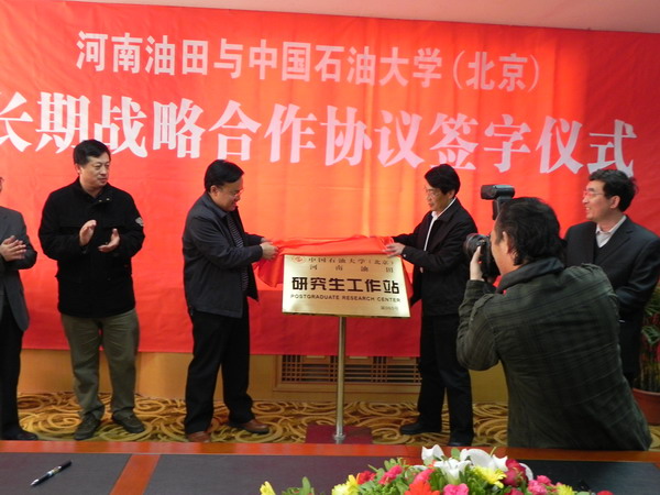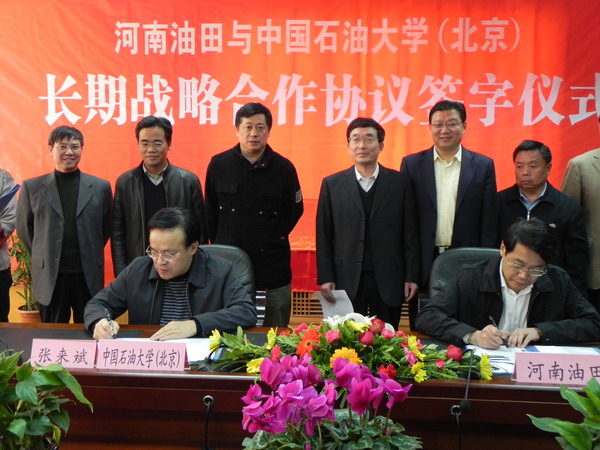 11月30日上午,中國石油大學與河南油田長期戰(zhàn)略合作協(xié)議簽字儀式在河南油田舉行。中國石油大學校長張來斌,河南油田管理局局長李聯(lián)五分別代表雙方在協(xié)議書上簽字,并為中國石油大學河南油田研究生工作站揭牌。