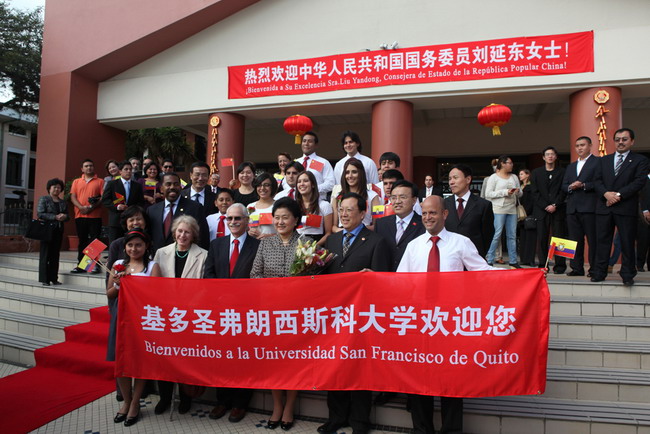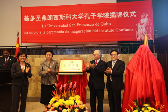 12月27日,厄瓜多爾基多圣弗朗西斯科大學校園彩旗招展,學校主樓中央大廳懸掛著《熱烈歡迎中華人民共和國國務委員劉延東女士》等條幅,大廳內四周懸掛著孔子名言大幅宣傳畫,在大紅燈籠、中國結、彩色鞭炮、大紅福字等襯托下,氣氛喜慶而熱烈。正在厄瓜多爾進行國事訪問的國務委員劉延東來到厄瓜多爾基多圣弗朗西斯科大學,為中國石油大學合作建設的基多圣弗朗西斯科大學孔子學院揭牌。參加揭牌儀式的還有教育部副部長郝平、國家漢辦主任許琳和中國石油大學校長張來斌等。