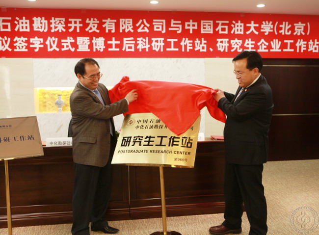 張士誠與賴豪魁分別代表學(xué)校與公司簽訂戰(zhàn)略合作框架協(xié)議和研究生工作站協(xié)議。李丕龍與張來斌一起為“中化石油勘探開發(fā)有限公司博士后科研工作站”、“中化石油勘探開發(fā)有限公司研究生企業(yè)工作站”揭牌。