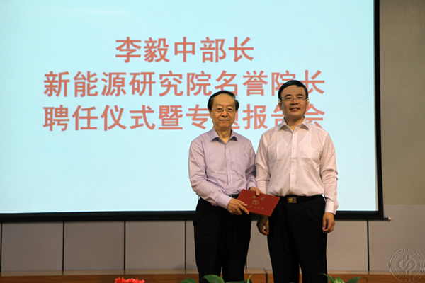 新能源研究院名譽院長聘任儀式由副校長徐春明主持,校黨委書記蔣慶哲代表學校為李毅中頒發新能源研究院名譽院長、兼職教授聘書。