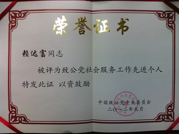 中國(guó)致公黨社會(huì)服務(wù)先進(jìn)每五年評(píng)選一次,旨在表彰全國(guó)各地基層組織中,社會(huì)服務(wù)工作中做出突出成績(jī)的先進(jìn)集體和黨員,進(jìn)一步激勵(lì)各級(jí)組織和全體黨員在平凡的工作中不斷開(kāi)拓創(chuàng)新、與時(shí)俱進(jìn)。賴達(dá)富多年來(lái)為在海內(nèi)外弘揚(yáng)中華民族文化藝術(shù)做出了突出貢獻(xiàn),在評(píng)選中脫穎而出,成為中國(guó)石油大學(xué)第一位獲此殊榮的教師。