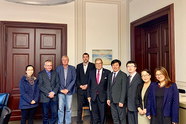 在羅斯托克大學,代表團一行會見了該校校長Wolfgang Schareck以及廢棄物與資源管理學院、活塞與內燃機實驗室負責人。雙方圍繞加強新能源、機械工程等專業領域合作與開展學生交流交換項目等內容深入探討并達成共識。代表團一行參觀了該校內燃機重點實驗室和廢棄物與資源管理重點實驗室。