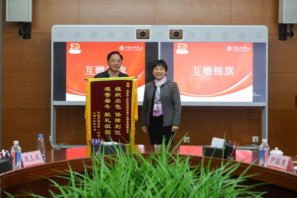 座談會(huì)開始前,石大與北京市國(guó)資委、農(nóng)工委舉行了互贈(zèng)錦旗儀式與游行服裝贈(zèng)予儀式。