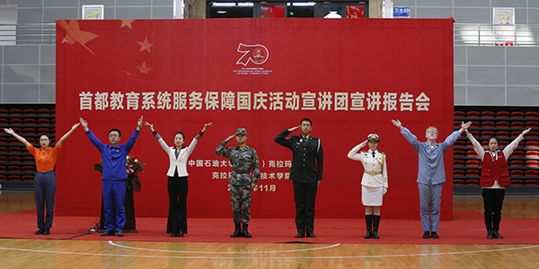 在中華人民共和國成立70周年慶祝活動中,首都教育系統以高度的政治自覺和使命擔當,組織9.6萬余名師生全方位、多層次參與國慶活動籌備工作,全天候、多領域做好服務保障,為國慶活動提供了重要的智力支持和人才保障。為表彰首都教育系統在服務保障國慶活動中作出的重要貢獻,10月24日,教育部簽署嘉獎令,對參與國慶70周年慶祝活動服務保障工作的全體師生予以嘉獎,并遴選師生代表組建了30個首都教育系統服務保障國慶活動宣講團,赴全國各地宣講。中國石油大學(北京)和北京石油化工學院聯合成團對口遼寧省,此次應校區邀請為師生宣講。10月15日和16日,宣講團還應克拉瑪依市各大學及中小學的邀請,先后至新疆醫科大學克拉瑪依學院、克拉瑪依市第三中學和克拉瑪依市實驗中學作了宣講,近1300名師生聆聽了報告,并對宣講團成員的表現給予高度評價。