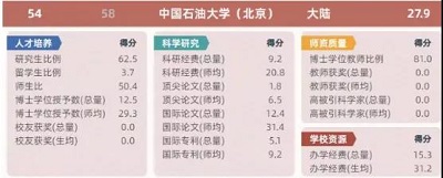 在“軟科2019中國兩岸四地大學排名”中,中石大位列第54名,較上一年度上升4名,位列中國大陸高校第36名。師生比、博士學位授予數、科研經費、國際論文數、國際專利數、辦學經費等分項指標得分均有提升,其中,國際專利-師均、辦學經費、辦學經費-生均漲幅分別為70.37%、50%、38.67%。