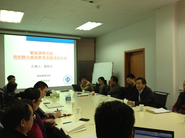 會上,新能源研究院直屬黨支部書記姜桂元對研究院黨的群眾路線教育實踐活動做了總結報告,全面總結了研究院開展黨的群眾路線教育實踐活動以來,在學習教育、聽取意見,查擺問題、開展批評和整改落實、建章立制三個階段開展的工作。報告指出,新能源研究院嚴格按照學校的統一部署,制定黨的群眾路線教育實踐活動方案,并扎實推進。在活動中廣泛聽取群眾意見,認真查擺問題,并依據群眾反映的意見和建議,研究梳理,制定整改方案。報告指出,新能源研究院黨的群眾路線教育實踐活動取得明顯成效:一是進一步統一了思想,凝聚了力量,明確了發展方向,為研究院的發展打下了良好基礎;二是解決了一批群眾關心的實際問題,并著眼長效機制,探索將好的做法固化形成制度。下一步,研究院將嚴格按照學校要求,把整改工作繼續落實,全心全意為廣大師生服務。