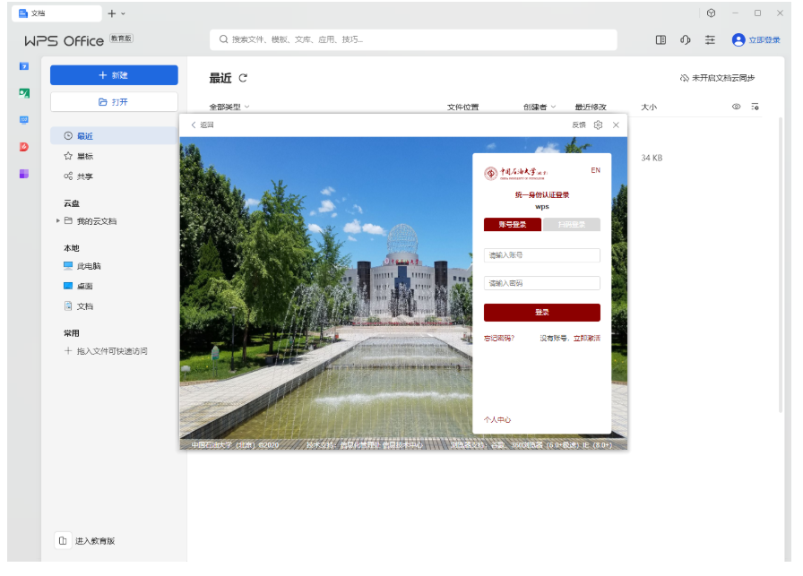 (1)通過正版化平臺或?qū)傧螺d頁面下載打開WPS客戶端,點(diǎn)擊右上角“立即登錄”;進(jìn)入中國石油大學(xué)(北京)統(tǒng)一身份認(rèn)證界面,輸入賬號密碼即可登錄使用。