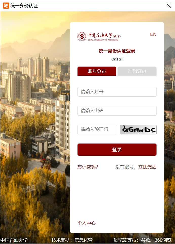 c.進(jìn)入中國石油大學(xué)(北京)統(tǒng)一身份認(rèn)證界面,輸入賬號密碼即可登錄使用。