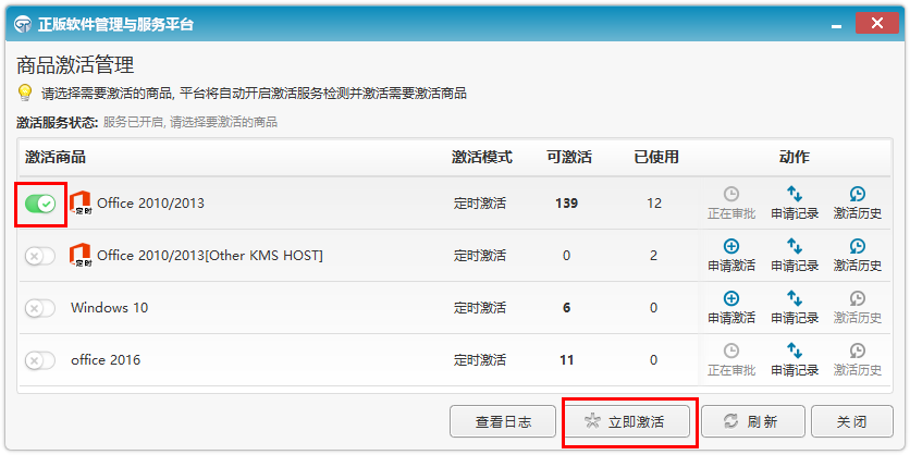 (5)登錄成功后,軟件自動彈出商品激活管理窗口(Windows和Office默認(rèn)各分配10次激活次數(shù))點(diǎn)擊左邊的選項(xiàng)按鈕,勾選需要激活的產(chǎn)品,然后點(diǎn)擊“立即激活”。