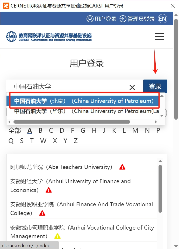 (3)選擇完CARSI后,系統(tǒng)將自動跳轉(zhuǎn)至CARSI登錄頁面,在方框中填入所在學(xué)校名稱,點(diǎn)擊“登錄”按鈕;(如遇到證書已過期提示,請點(diǎn)擊繼續(xù)登錄即可)