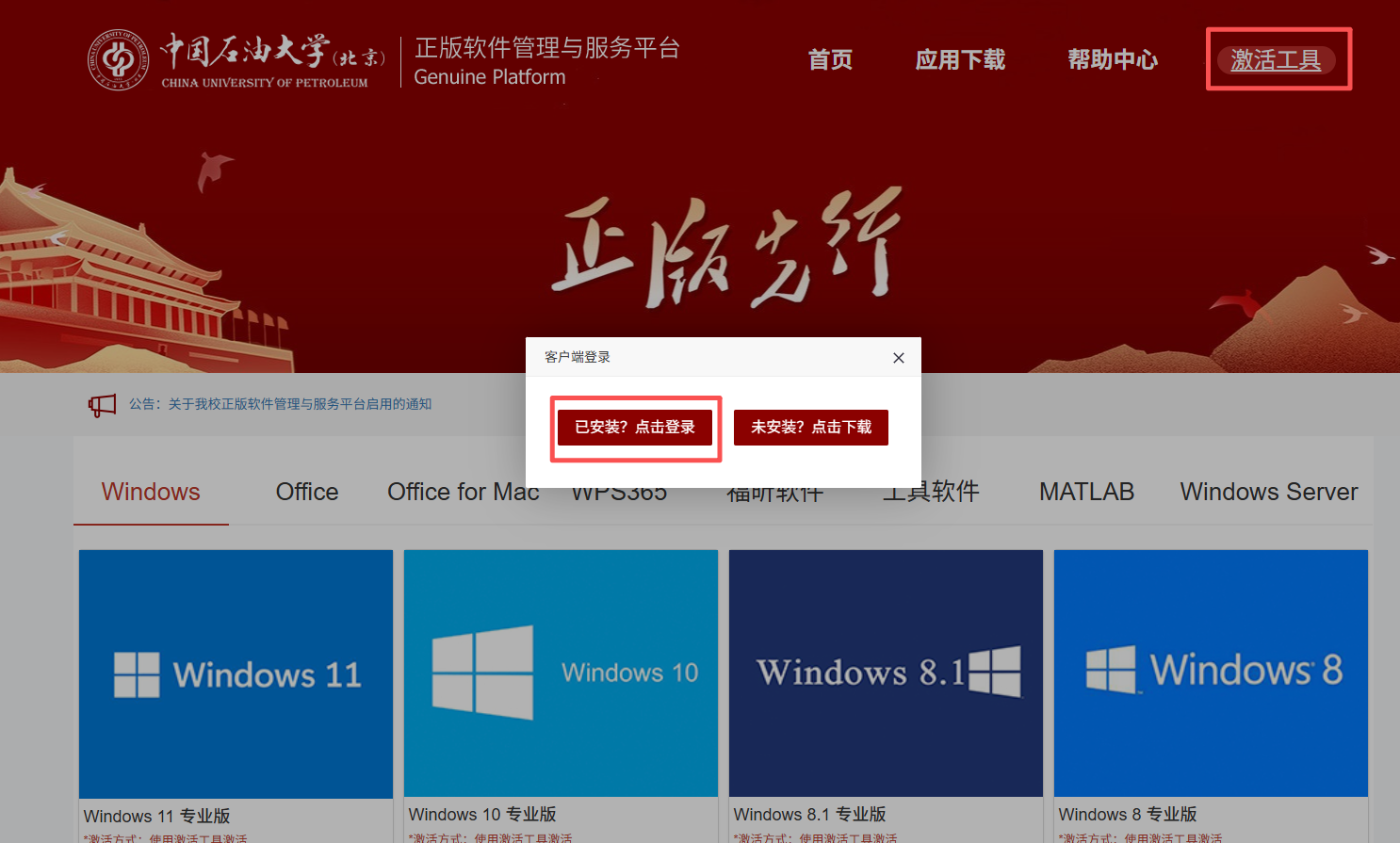 (4)安裝完成后,點(diǎn)擊正版化平臺首頁激活工具-已安裝,點(diǎn)擊登錄。