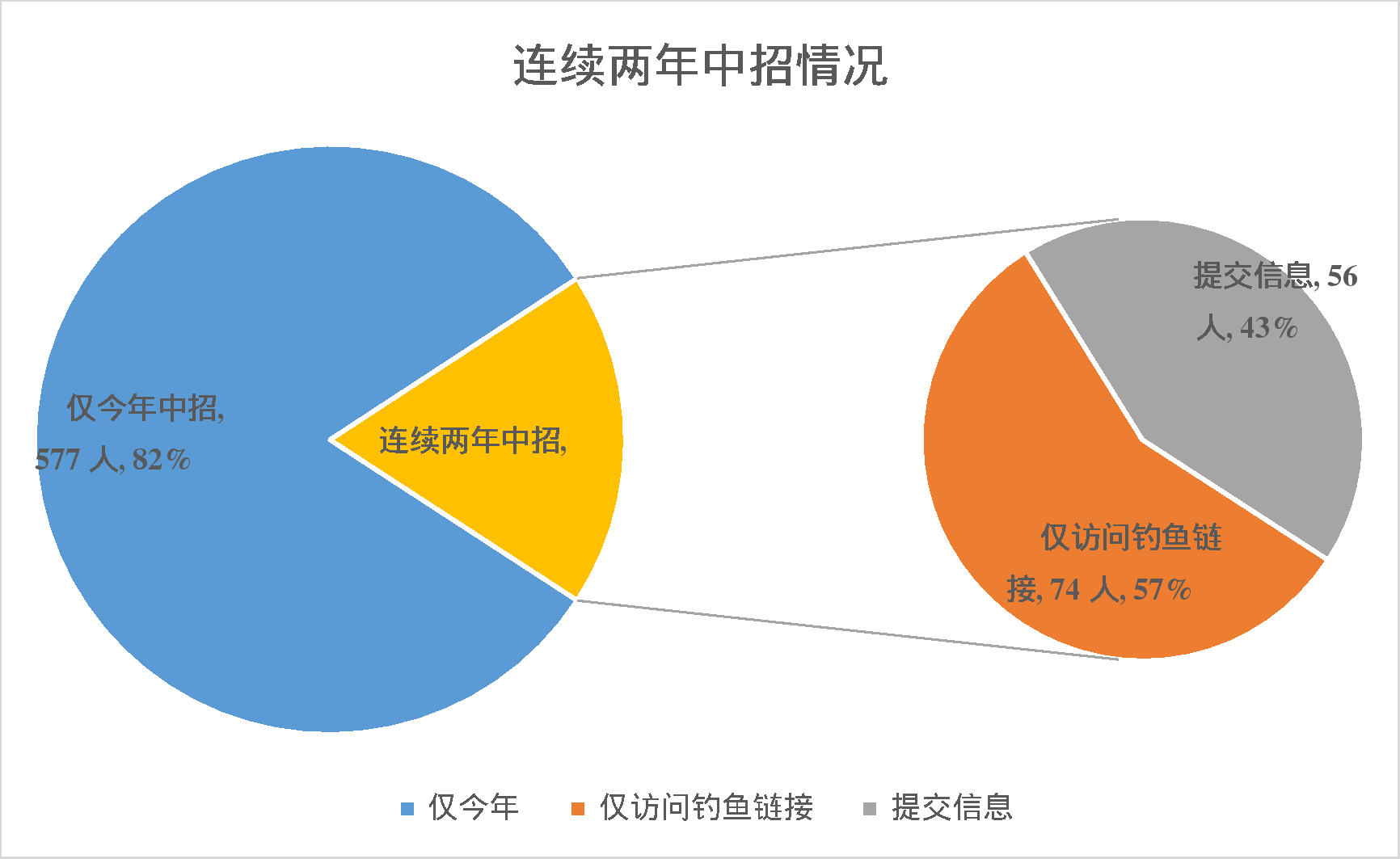 2023年釣魚演練中共有711位師生中招,2024年共有707位師生中招,相比于2023年略有減少幅度,師生防釣魚意識有所提高。但從整體情況看,師生安全意識仍然較為薄弱,存在較大安全隱患,其中連續兩年中招人數共計有130人,占今年中招的總人數的18.39%。連續兩年都中招輸入賬號密碼的人數為56人,訪問釣魚鏈接的人數為74人。