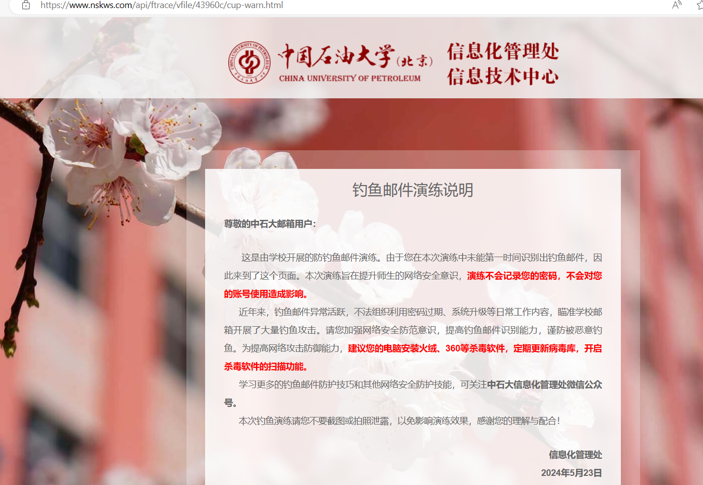 ④報告可疑郵件:如果收到疑似釣魚郵件或其他可疑信息,請及時向相關部門或郵箱管理員報告,可發送至webmaster@cup.edu.cn。