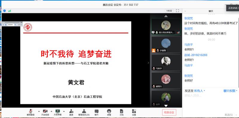 2020年6 月6日上午9:00-10:30,石油工程學院“思而博智,學而昊晟”講座暨學術人生講座(第五期)在騰訊會議圓滿舉行。校青年拔尖人才黃文君擔任主講,活動由研會許富強主持。