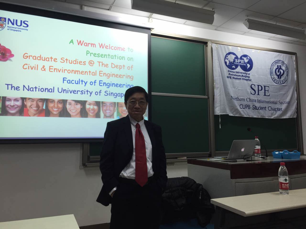 12月14日上午10點,新加坡國立大學土木與環(huán)境工程學院劉漢中教授來到我校,在逸夫樓101開展以“新加坡國立大學石油工程碩士、博士及博士后項目介紹”為主題的宣講會。