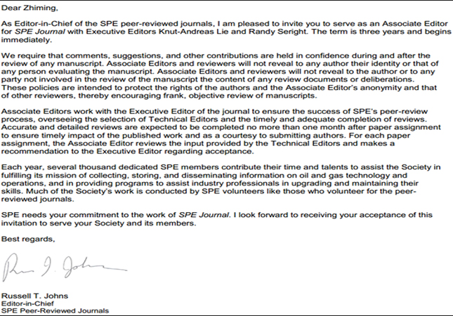 近日,收到SPE Journal主編和執行主編共同來信邀請,石油工程學院2015級油氣田開發工程專業博士研究生陳志明被聘任為該雜志的副主編,任期三年(2018年~2021年),目前亞太區石油類高校僅1人。