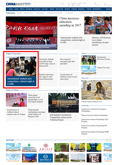 中國(guó)日?qǐng)?bào)網(wǎng)(英文)Education頻道首頁以“International students join competition, cultural night at CUPB”