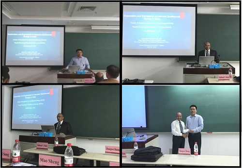 Shah教授首先分析了印度地熱田的開發利用情況,包括地理位置、地質條件、生產排量和采出溫度;介紹了成立的地熱能卓越中心(CEGE),組織成員與研究進展;重點展示了CEGE在Dholera、Unai和Candhar地質勘探,地熱發電和地熱供暖的發展情況。為了推廣地熱利用和避免化石燃料的過度消耗,目前中心成功建立了印度首個循環熱泵系統,可有效改善區域供暖和制冷;然后,介紹了CEGE舉辦的第三屆國際地熱會議,并對地熱中心的未來研究計劃進行了展望;最后,Shah教授詳細講述了地熱中心的DCS實驗室,可用于鉆井液、水泥漿、裂縫導流能力及儲層傷害方面的深入測試和評價,旨在為地熱推廣利用提供技術支撐。講座結束后,與會師生與Shah教授進行了積極的學術交流與互動,現場氛圍熱烈。