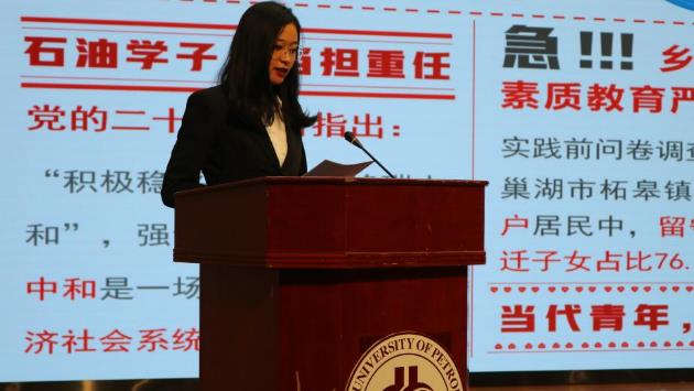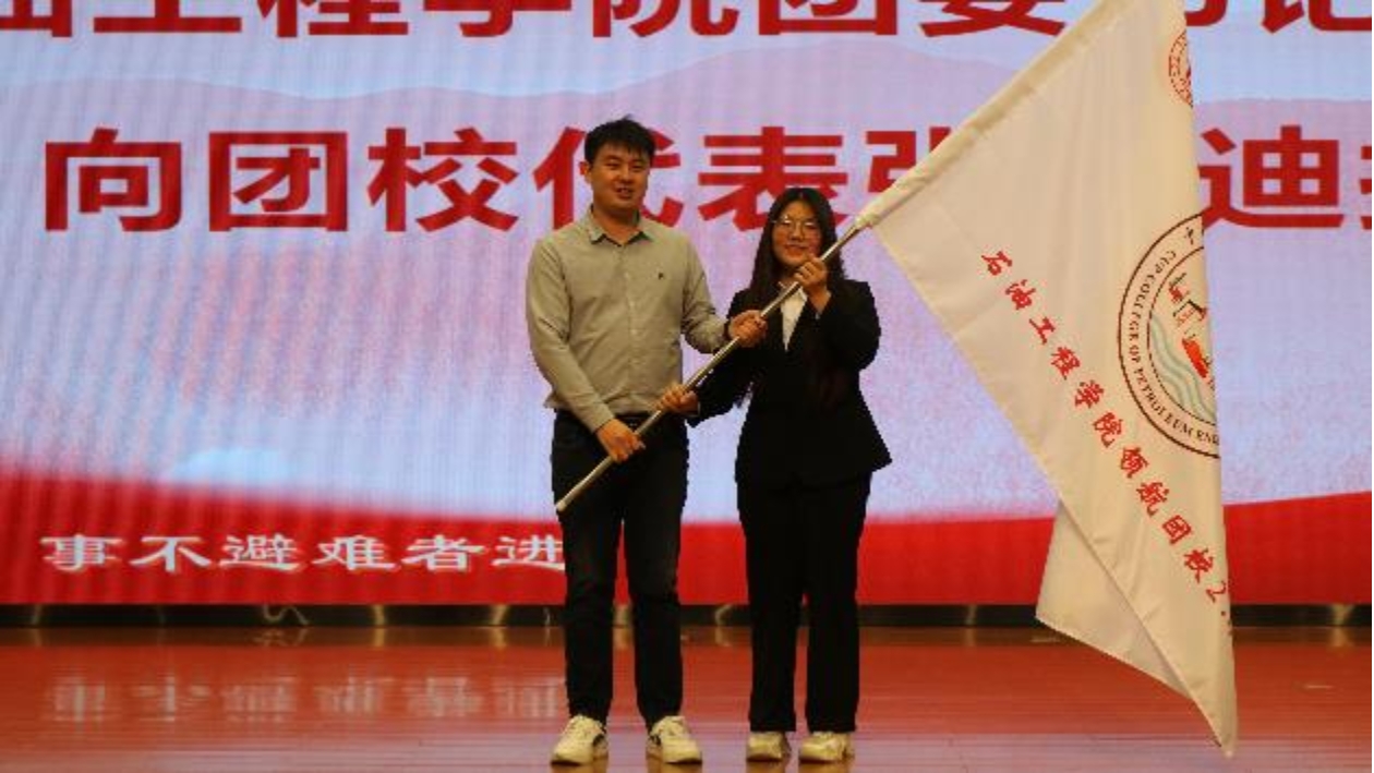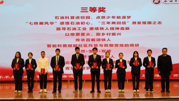 2023年暑假,石油工程學院組織開展第五期“鐵人精神訓練營”,學院青年學生積極投身社會課堂,將小我融入大我,青春獻給祖國,取得了良好的育人效果和積極的社會反響。經過評比展示,涌現出20支優秀社會實踐團隊。肖亞楠宣讀社會實踐優秀團隊表彰決定,劉東東為獲獎團隊代表頒發獲獎證書。