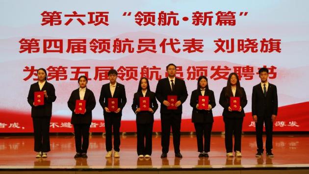 肖亞楠向團校代表張安迪授領航團校校旗,第四屆領航員代表劉曉旗為第五屆領航員頒發聘書。新一屆領航員將帶著學校的期待、學院的囑托,帶領學員們揚帆起航,再創佳績。第五屆領航員代表張安迪發言,她鼓勵同學們深刻認識青年的使命擔當,求真務實、全面發展,切實踐行鐵人精神,爭做新時代鐵人。