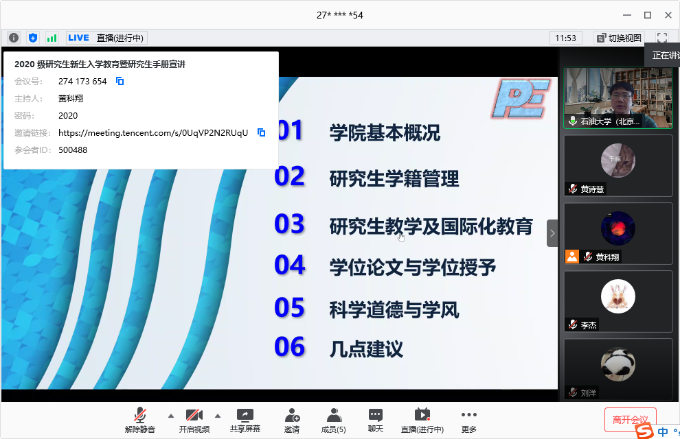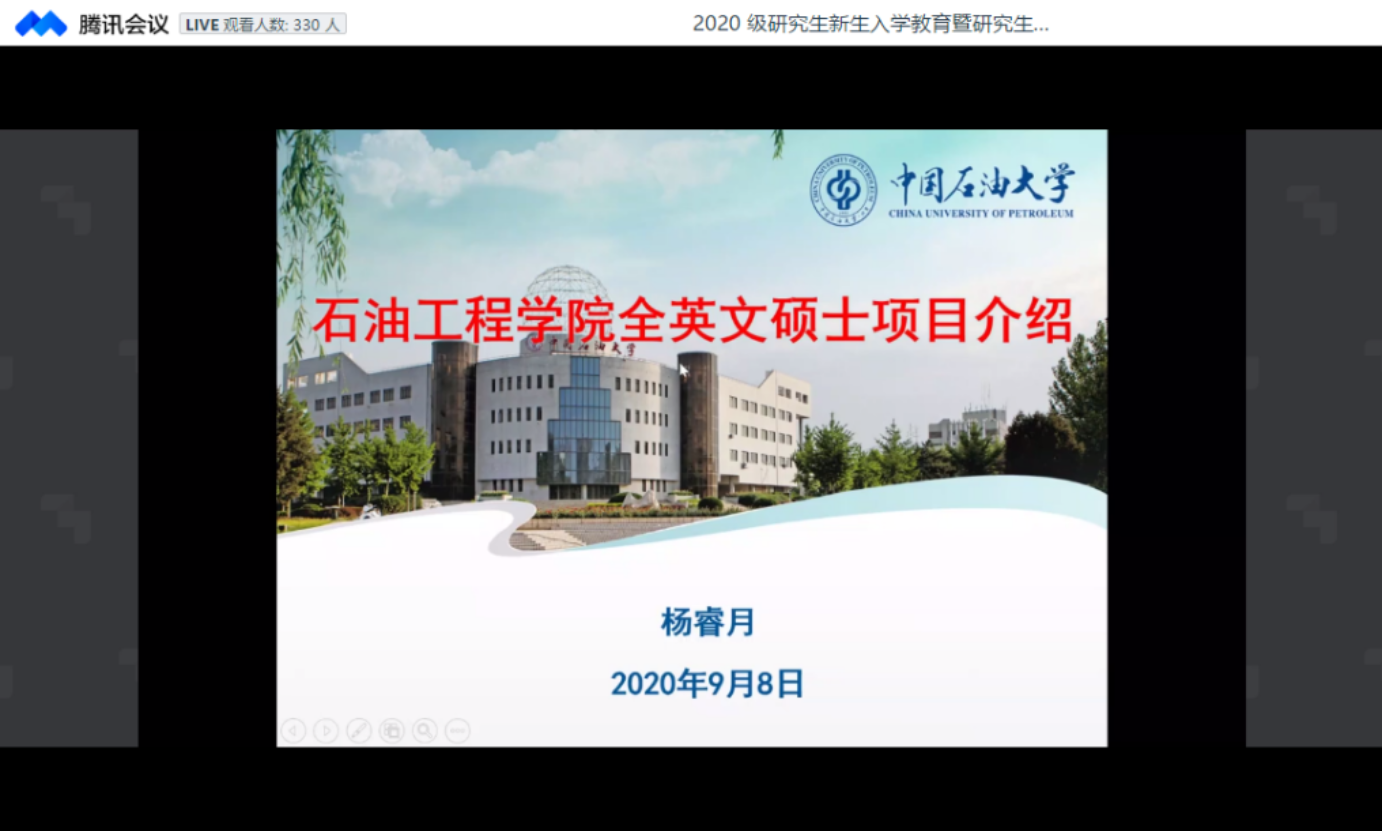 9月8日上午九點,本著疫情期間盡量避免組織大型集體聚集性活動的原則,石油工程學院2020級研究生新生入學教育暨學院國際班宣講在騰訊會議線上成功舉行。同時同學們在騰訊會議直播平臺進行直播觀看。石油工程學院副院長劉偉、全英文國際碩士班班主任楊睿月、2020級研究生輔導員李杰出席本次會議。本次大會由石油工程學院研究生會主席黃科翔主持。